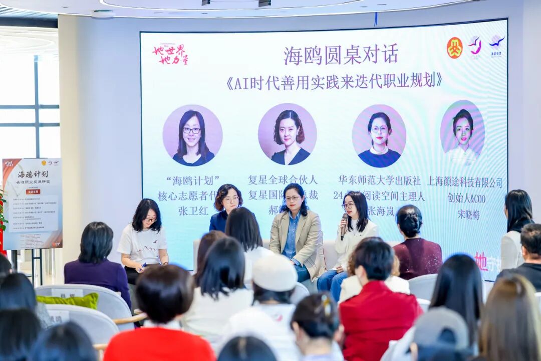 在海鸥圆桌讨论环节,焦点直指当下最热的命题——《Ai时代,善用实践来迭代职业规划》。复星全球合伙人、复星国际副总裁郝毓鸣,华东师范大学出版社24小时阅读空间主理人张海岚,上海颜途科技有限公司创始人&首席运营官宋晓梅与特约主持人“海鸥计划”核心志愿者代表张卫红,分别从科技之路、AI新职业之路、项目策划之路等维度展开了深度探讨。